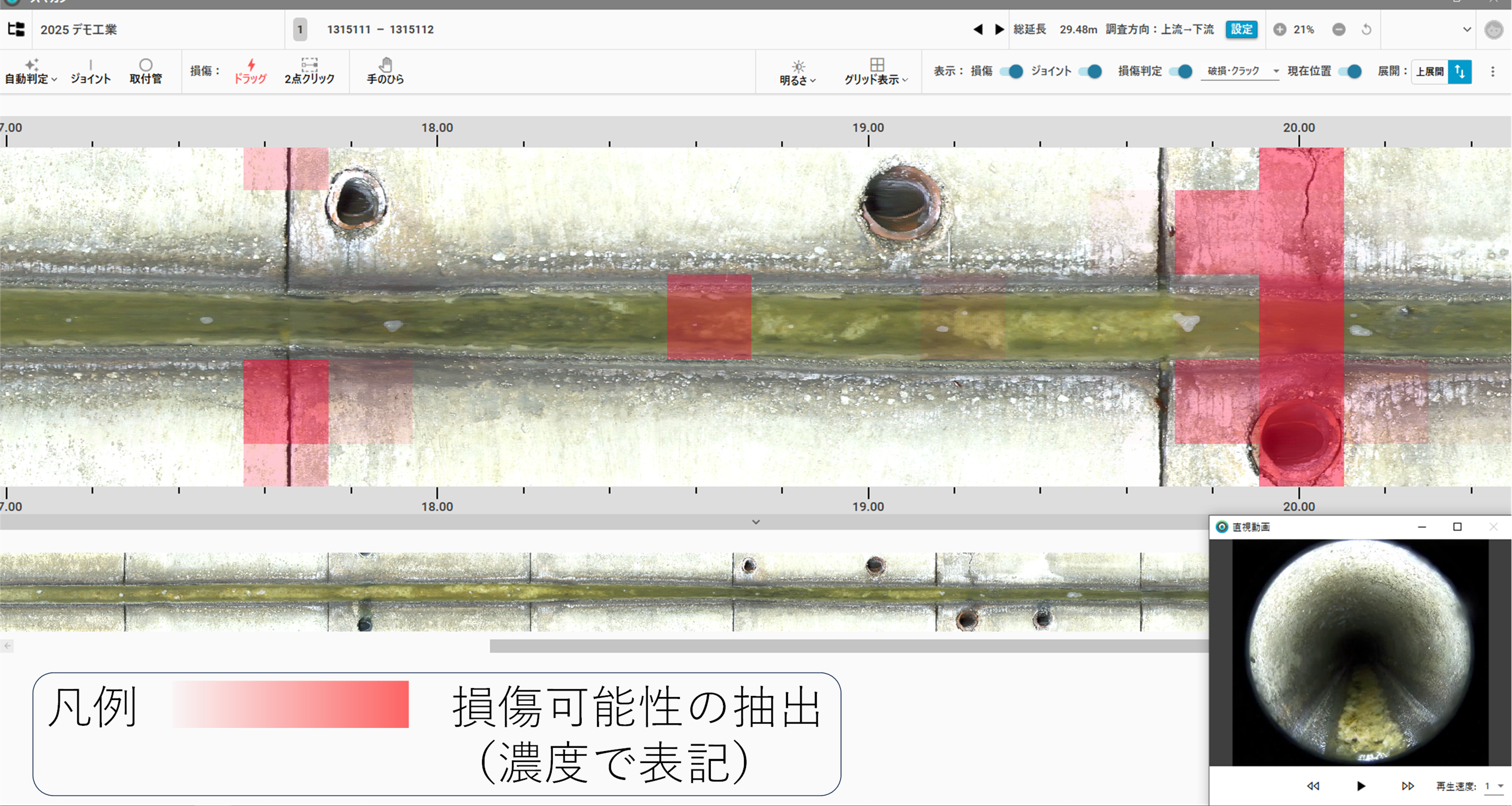本ソフトウェアに、画像から物体や損傷を抽出する2つのAI機能「管構造抽出AI」と「損傷可能性抽出AI」を実装しました。「管構造抽出AI」は、点検結果入力の際に、管と管の接続部(ジョイント)や本管と汚水桝の接続部である取付管の位置を展開画像から自動抽出するものです。「損傷可能性抽出AI」は、損傷の可能性がある箇所を自動抽出するもので、視覚的に分かりやすいように損傷可能性が高い箇所ほど濃い赤色で表示します。